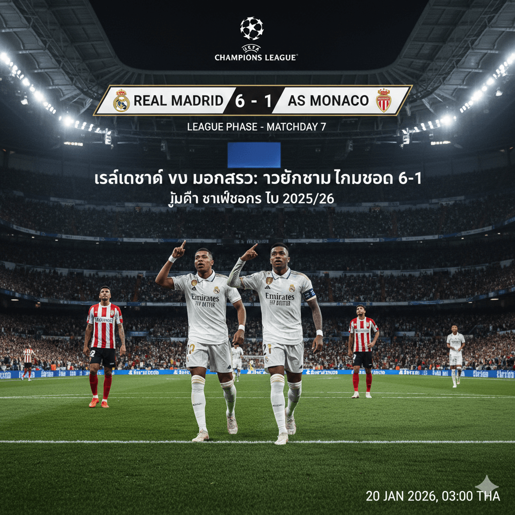 การแข่งขันฟุตบอลยูฟ่า แชมเปี้ยนส์ ลีก 2025/26 รอบลีกเฟส นัดที่ 7 ระหว่าง เรอัลมาดริด พบ มอนาโก จบลงด้วยชัยชนะขาดลอยของเจ้าบ้าน 6-1 ที่สนามซานติอาโก้ เบร์นาเบว เมื่อวันที่ 20 มกราคม 2569 เวลา 03:00 น. ตามเวลาประเทศไทย เกมนี้ราชันชุดขาวโชว์ฟอร์มร้อนแรงโดยเฉพาะ คีลิยัน เอ็มบัปเป้ และ วินิซิอุส จูเนียร์ ที่ช่วยกันสร้างสกอร์ถล่มคู่แข่ง